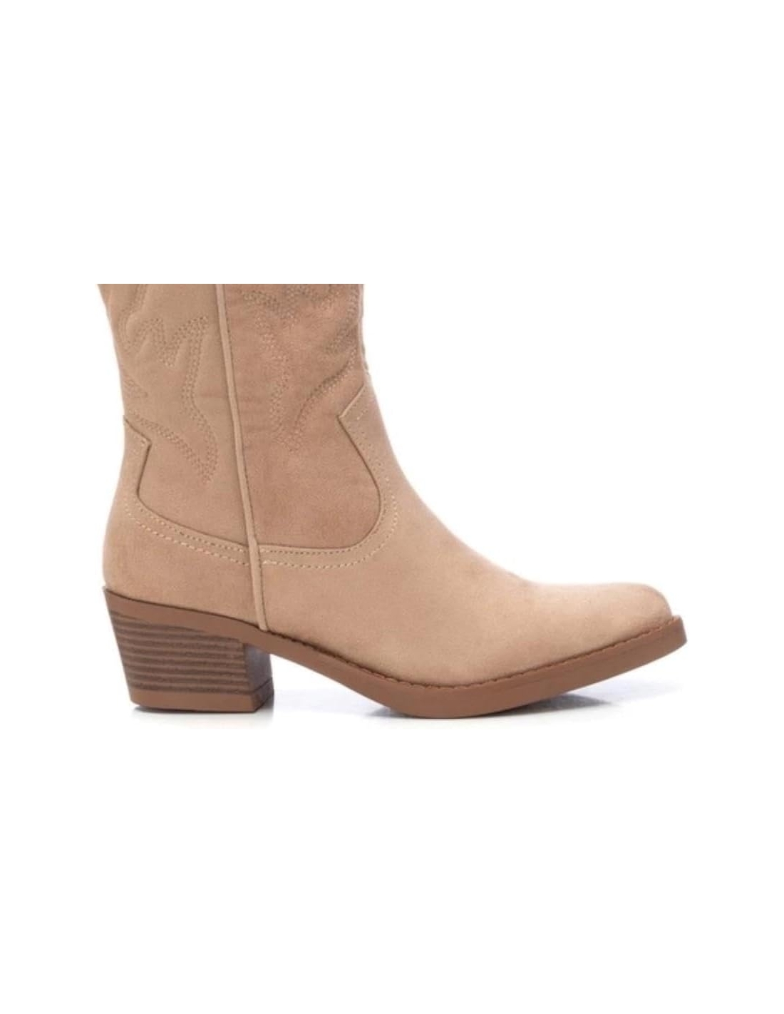 Bota de mujer elaborada en suave antelina con bordado acolchado en el lateral. Punta fina y tacón estilo cowboy, en tendencia esta temporada. Suela de goma antideslizante. Este modelo ha obtenido el certificado vegano por la organización mundial PETA (Organización de los derechos de los animales).