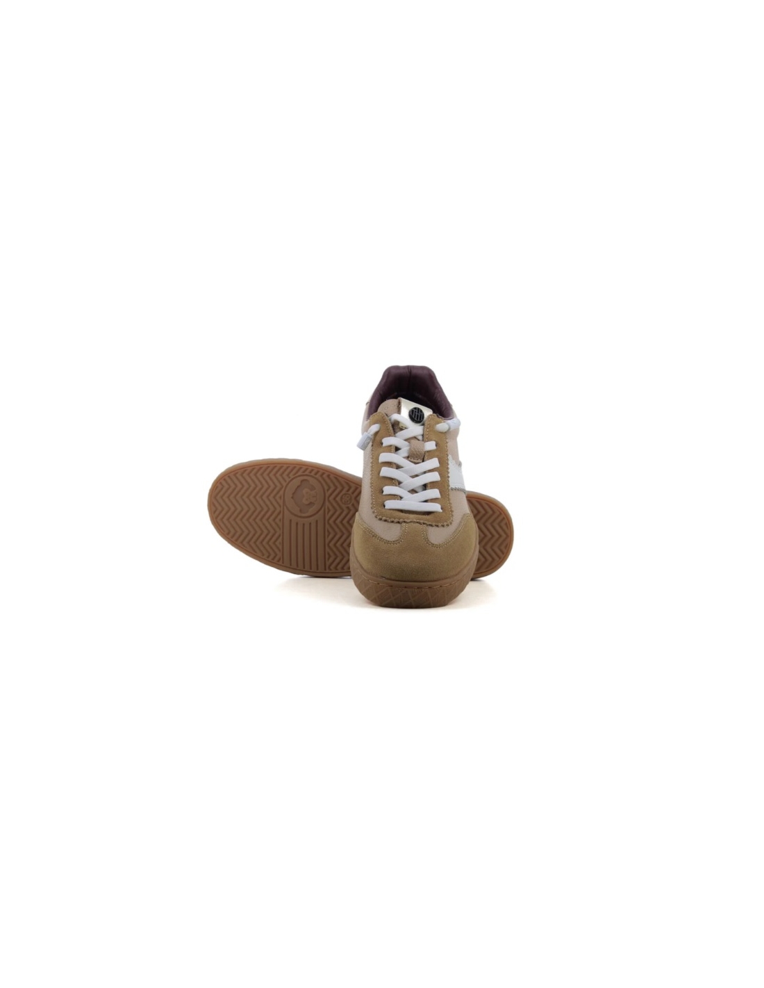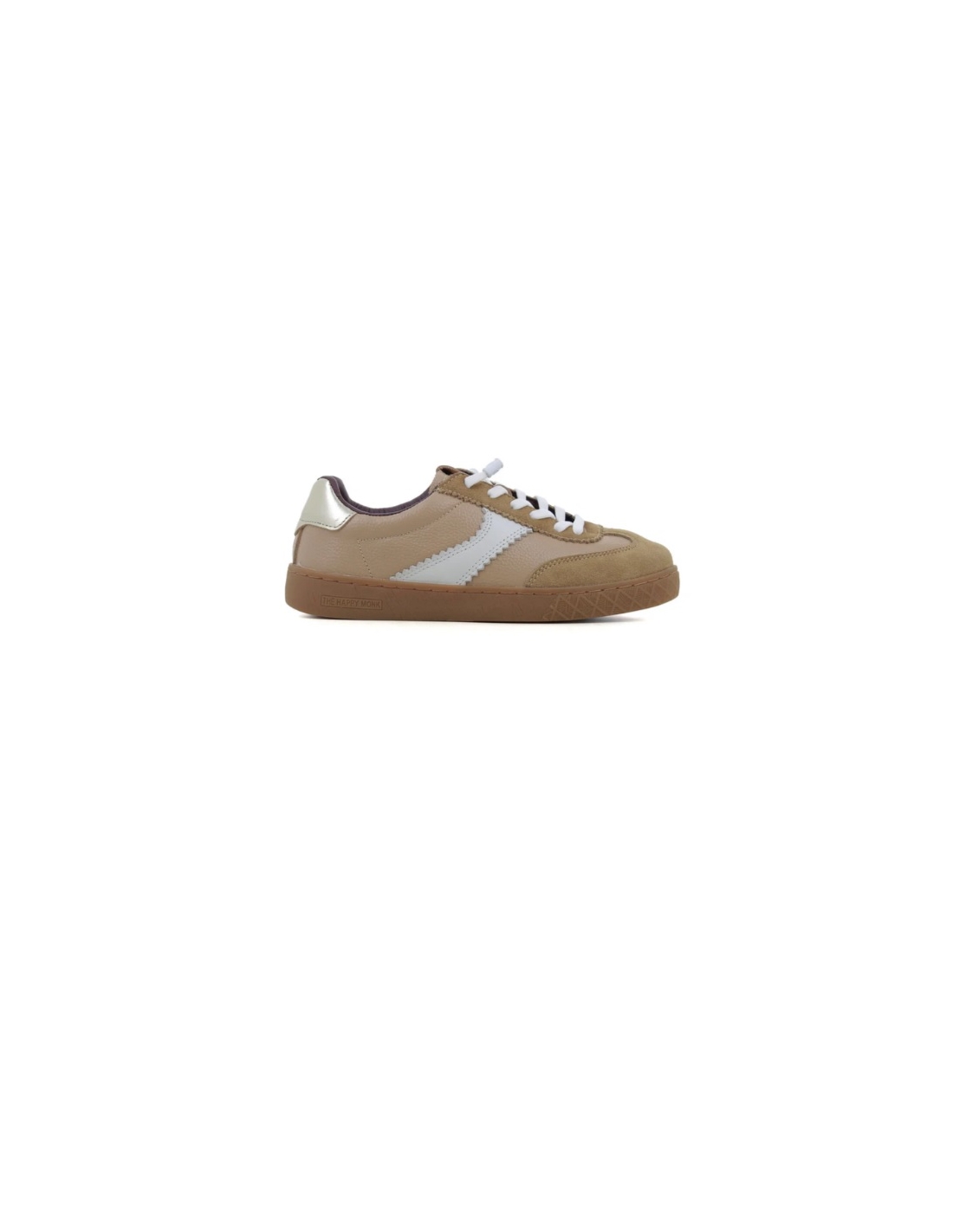 Sneaker de mujer fabricada en piel color beig con cordones elasticos y piso en goma color caramelo.