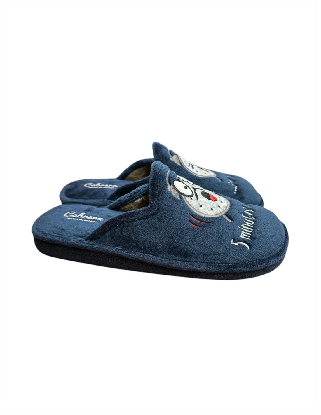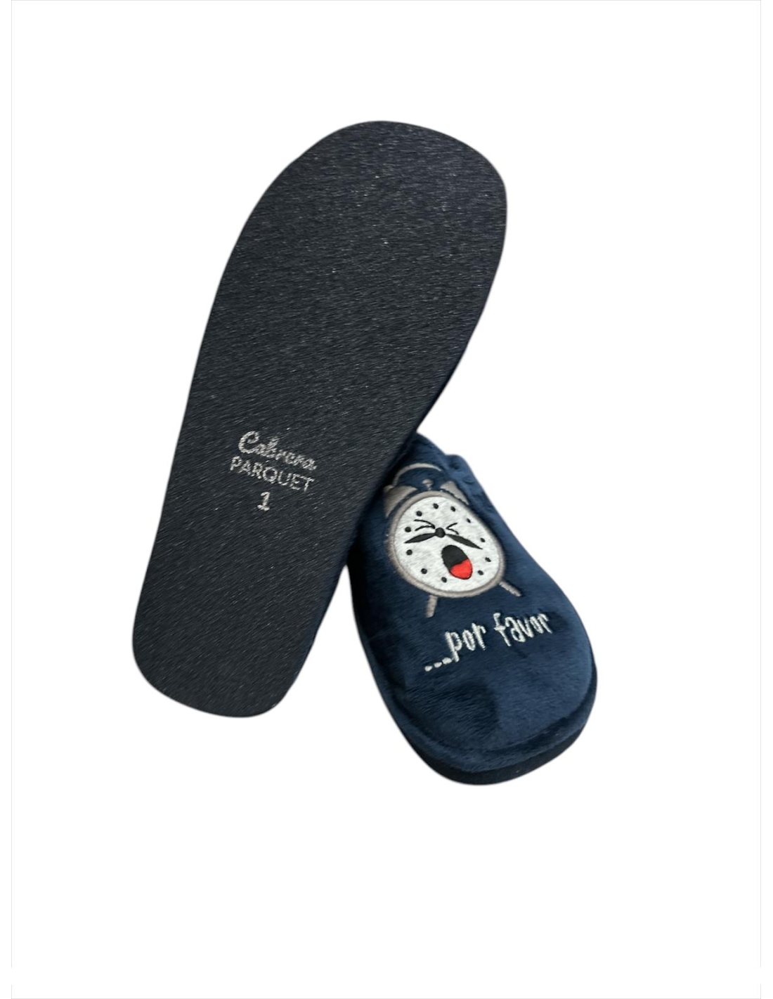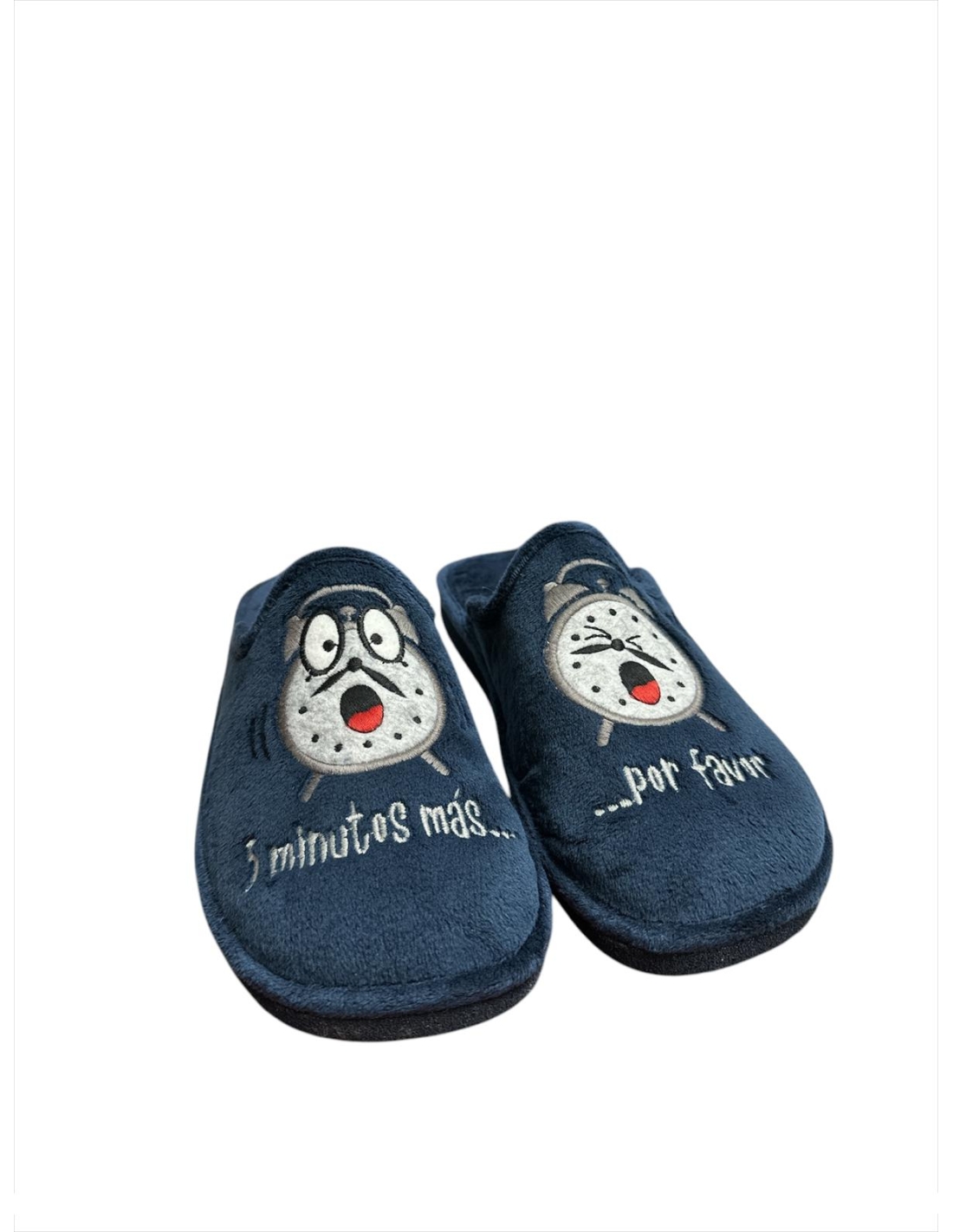 - El tejido exterior suave en azul se combina con un alegre bordado de un reloj en tonos grises, un detalle que no pasa desapercibido. Lo original de este modelo es que el dibujo del reloj está dividido entre las dos zapatillas, formando un conjunto único.